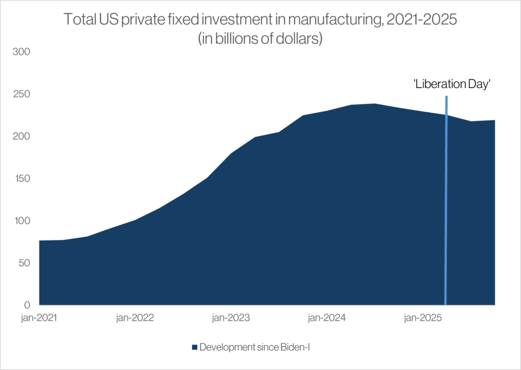 One year after Liberation Day, investment, construction, business cycle, and labour market indicators give no sign of a revival in American manufacturing. Given the structure of US imports, labour market tightness, and the volatility of trade policy, it is far from certain that continuing the current approach will achieve the intended re-industrialisation.