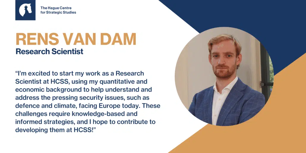 “I’m excited to start my work as a Research Scientist at HCSS, using my quantitative and economic background to help understand and address the pressing security issues, such as defence and climate, facing Europe today. These challenges require knowledge-based and informed strategies, and I hope to contribute to developing them at HCSS!”