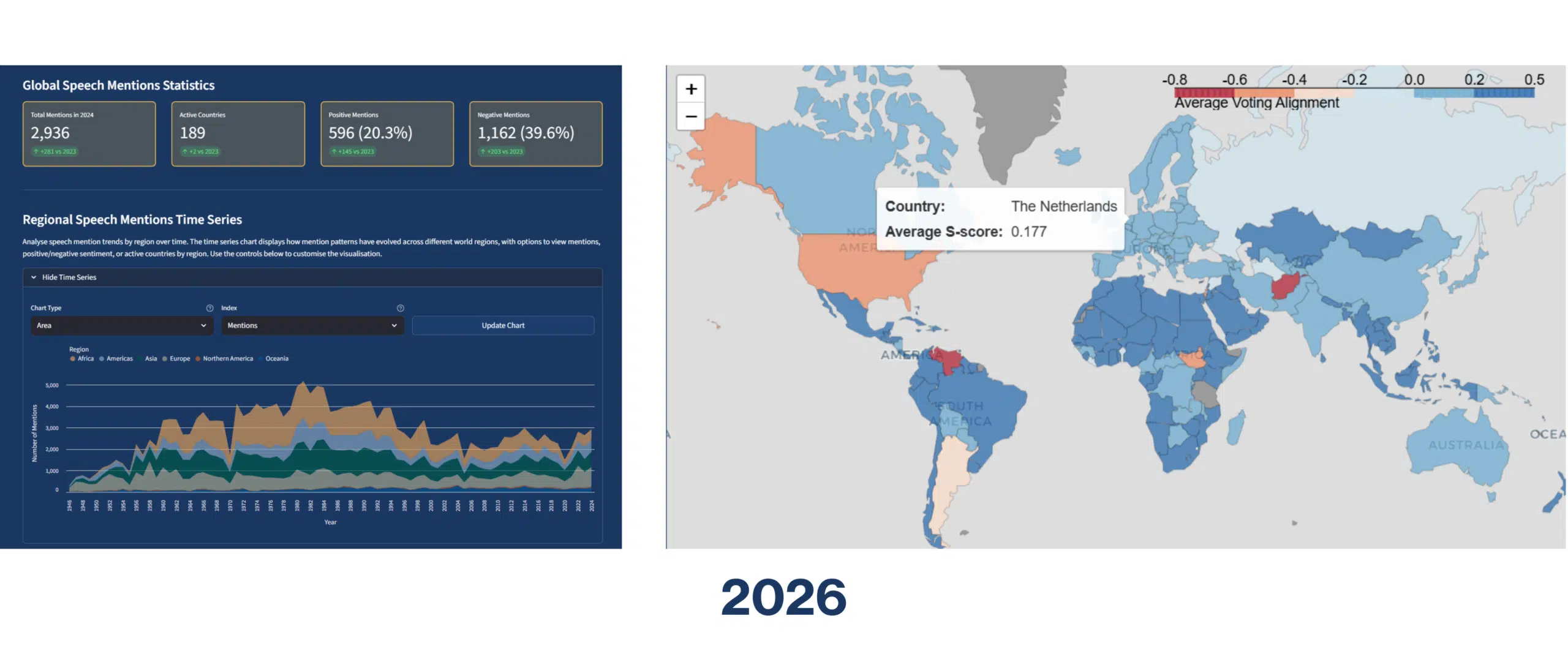 The dashboard integrates more than 10,000 official UN speeches containing over 350,000 dyadic state references, alongside data from more than 6,000 UN voting resolutions and over 15,000 recorded state leader visits worldwide. All data are retrieved from open-source sources and harmonised within a single analytical environment, enabling systematic comparison across countries, regions, and time periods.