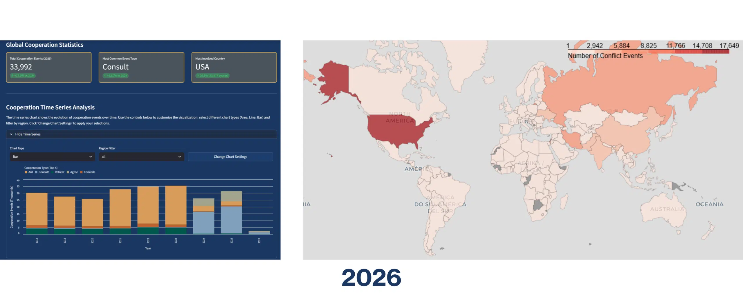 The platform features an interactive network and global map highlighting country-level involvement in cooperation and conflict, next to a temporal distribution of events and state profiles. Users can access aggregated statistics for selected periods and generate customisable time series to track trends changes in interaction intensity over time.