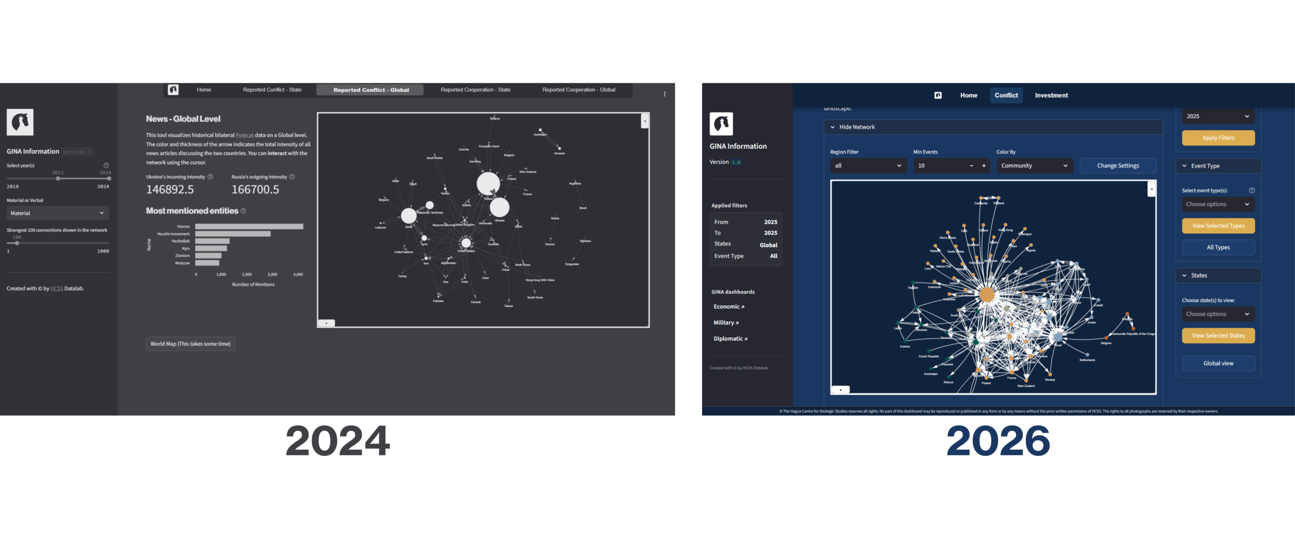 GINA Information captures both verbal and material cooperation and conflict events, allowing users to analyse geopolitical signalling based on news data and to explore the latent dynamics of cooperation and contestation that often precede measurable outcomes. Rather than focusing solely on more ‘traditional’ indicators such as number of casualties, economic flows, or arms transfer, the tool enables policy-makers, researchers, and analysts to examine how states communicate, coordinate, compete, and contest narratives through observable geopolitical events on a dyadic level. Built on event data structured around the PLOVER ontology and drawing on POLECAT (historical coverage through 2018-2023) alongside HCSS’s EDGAR dataset (from 2024 onward), the platform applies network science to map relational structures shaping the international information environment at the global and state level scale.