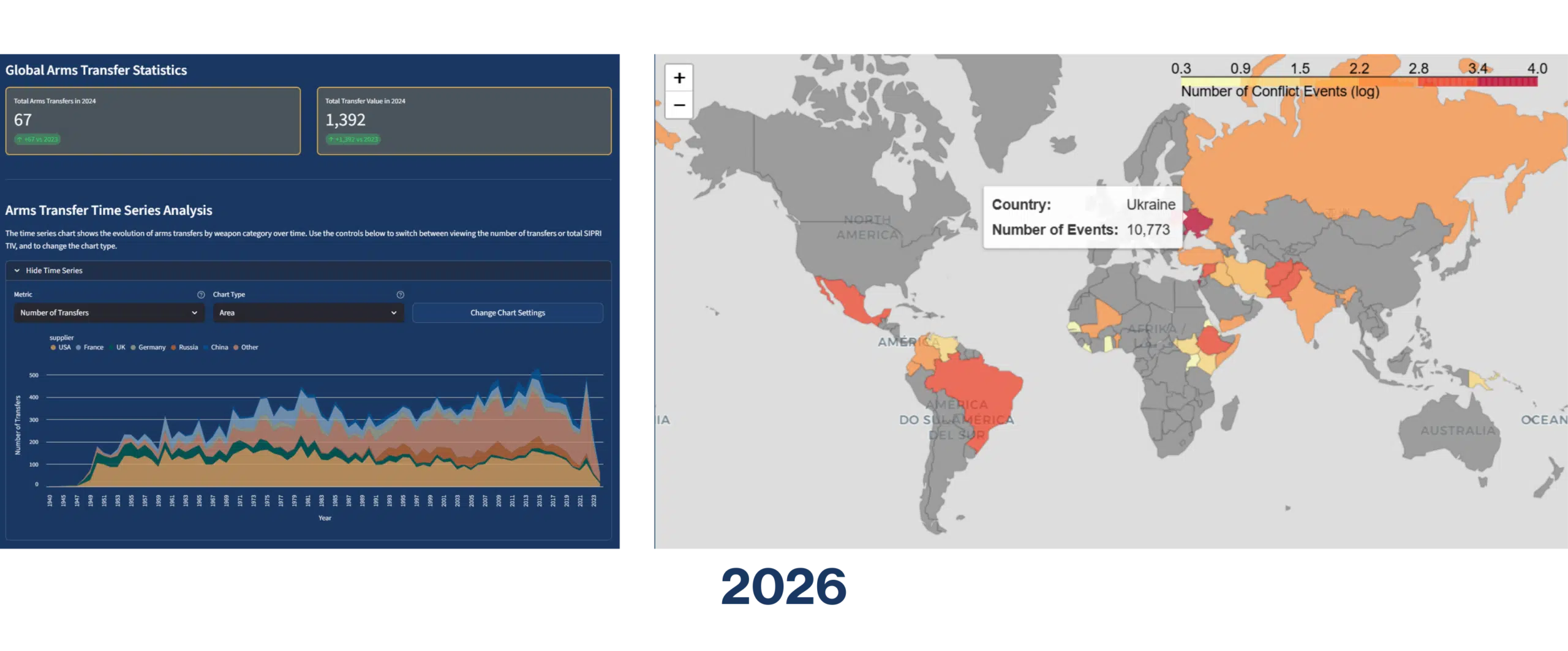 Users can explore two distinct but complementary networks, one capturing violent interactions between armed actors, and another tracing the exchange of military capabilities between states. This layered structure reveals where cooperative defence ties intersect with, reinforce, or contrast against conflict patterns. Temporal coverage extends from 1989 to 2024 for organised violence data and from 1950 to 2024 for arms transfers.