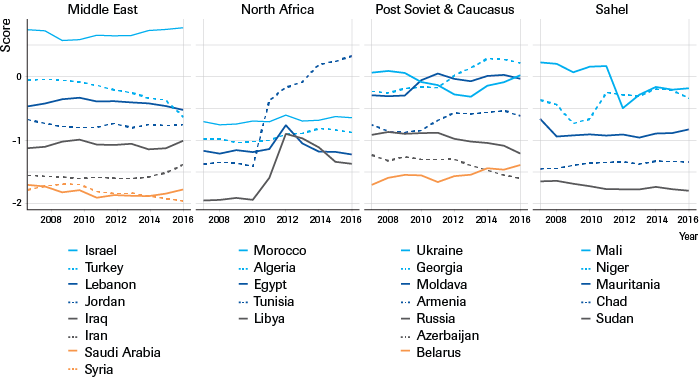 All of the countries in the periphery of Europe, with the exception of Saudi Arabia, have signed and ratified the ICCPR. The Covenant is monitored through the Human Rights Committee, but only Algeria, Tunisia, Libya, Turkey, the Caucasian republics, and the countries in the eastern flank of Europe accept its jurisdiction. When we look at trends in the countries at issue, we see that voice and accountability have significantly decreased in countries such as Turkey, Libya, Azerbaijan, and Russia. Increases could be noted in Iran, Iraq, Belarus, and, above all, Tunisia.