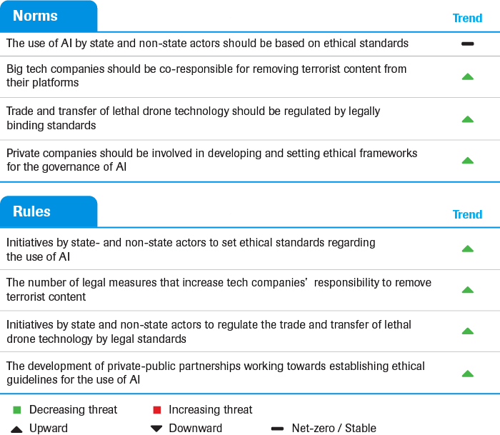 Threat assessment (chapter 2). To analyze the threats, a horizon-scanning method was used, involving a structured investigation of the six threat themes in the literature from government, international organizations, think tanks, and academia, supplemented with information from media and social media. Expressed in a set of indicators for each of the investigated themes, the developments over the last ten years were assessed and further validated using expert judgment. These sets of indicators then served as a basis for making statements on the trends expected over the next five years (up to 2025). Finally, the findings on the threats were linked to the Dutch national security interests to see whether and to what extent they are actually threatened. The Strategic Monitor considers three core interests: 1) national legal order and public security; 2) international legal order; and 3) economic prosperity. These three interests are derived from those used by the various ministries and are consistent with the Constitution, the Charter for the Kingdom of the Netherlands, and further Dutch legal obligations.[21] In the six respective trend tables in chapter 2, upward trends are indicated with , downward trends with , and stable trends with . These trends are further qualified as being either positive () or negative () in character, based on their impact on the three Dutch national security interests.