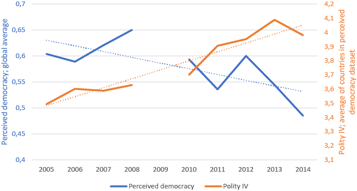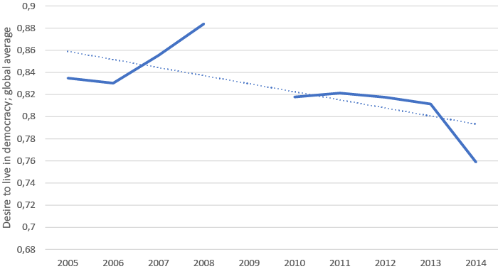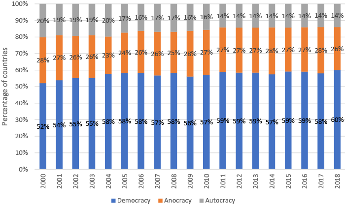 Political. Overall, to the question whether the world has become more democratic, the answer is negative on balance – though it appears positive at first sight. A great number of countries have transitioned to democracies, which now constitute a majority of nations worldwide. The proportion of the global population living under democracy has increased in both absolute and relative terms from 3.4 billion (57%) at the turn of the century to 4.3 billion (58%) in 2018. These positive macro-level trends notwithstanding, this study finds evidence to suggest that the foundational liberal norms of democratic regimes are under significant strain. Democracy is being hollowed out. The share of people expressing a desire to live in a democracy has decreased between 2005-2014, and global average voter turnout has decreased from 68% to 61% (2000-2018). Individuals who live under it are also increasingly perceiving it as dysfunctional, with data from a 2018 Pew Research survey showing that 51% of the respondents are not satisfied with the way democracy works in their countries.